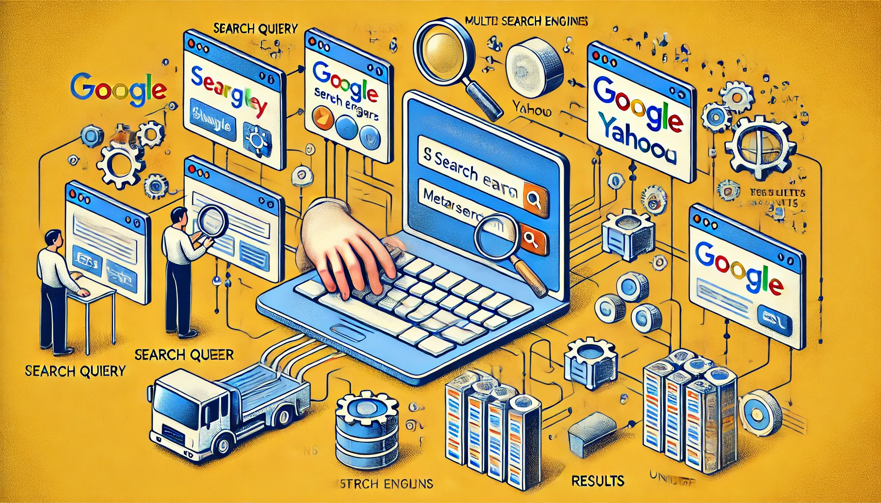 Figure 2: Overview of how a metasearch engine works. It demonstrates how a metasearch engine queries multiple search engines, aggregates the results, and presents them to the user.